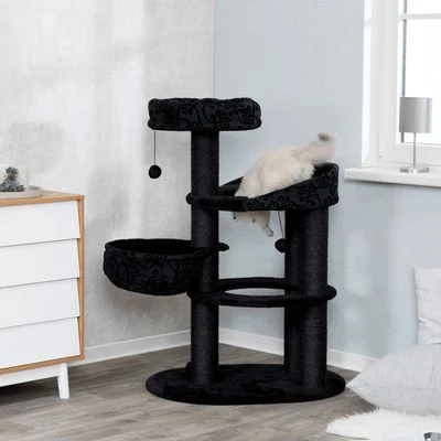 Stylish cat tree for large breeds, with striking black plush and floral velour covers, 8 12cm-diameter sisal posts, hammock, removable bed & rustle base plate. Dimensions: 77 x 58 x 114 cm (L x W x H)