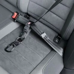 Robust strap for fastening your dog into the car, with a range of attachment options, with a metal ring and carabiner that can fasten to the car seatbelt and keep your dog safe.